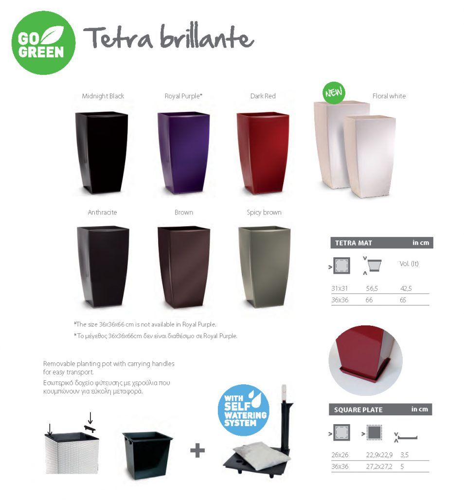 * Προαιρετικά για εσωτερική χρήση μπορεί να τοποθετηθεί set αυτοποτισμού ή κάδος μεμονωμένος . Αγοράζοντας το σύστημα αυτοποτισμού Go Green για Tetra & Natura μετατρέπετε τη γλάστρα σε αυτοποτιζόμενη.