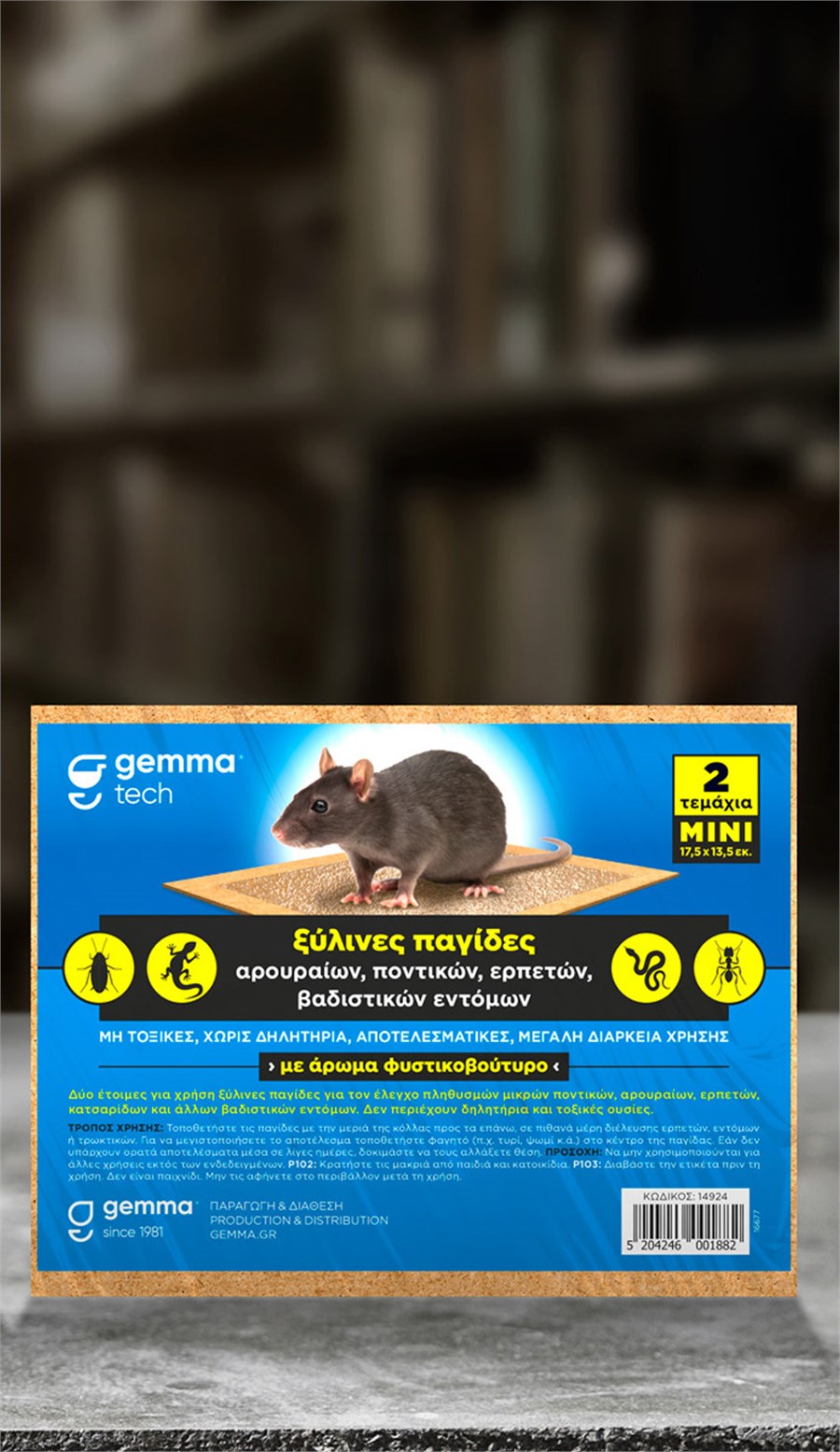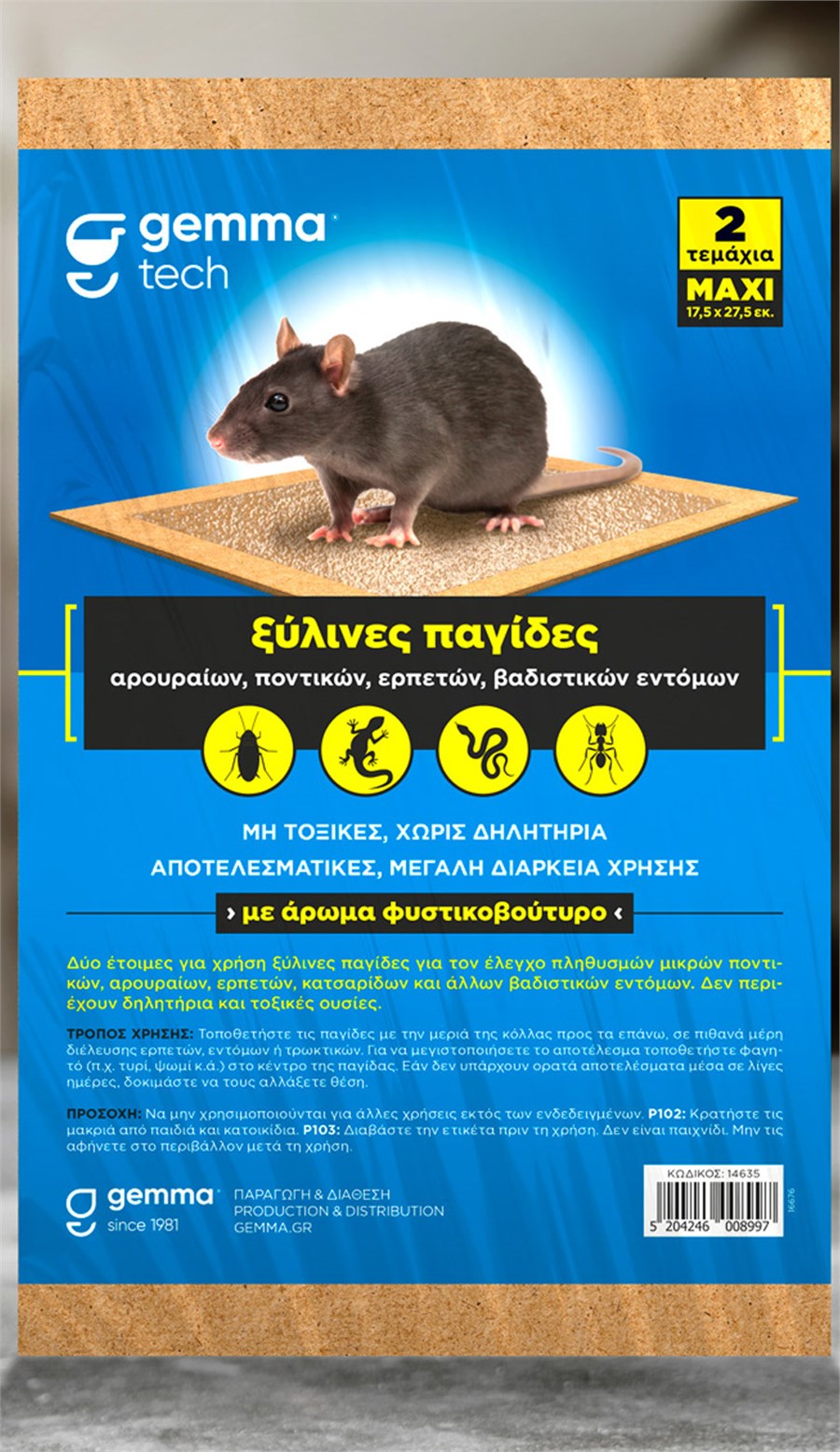 Με το ειδικό άρωμα από φυστικοβούτυρο προσελκύει τα τρωκτικά τα οποία αναζητούν τροφή όταν εισέρχονται σε έναν χώρο. Η κόλλα παγιδεύει το τρωκτικό. Η ξύλινη επιφάνεια εξασφαλίζει την παγίδευση μεγάλων αρουραίων.